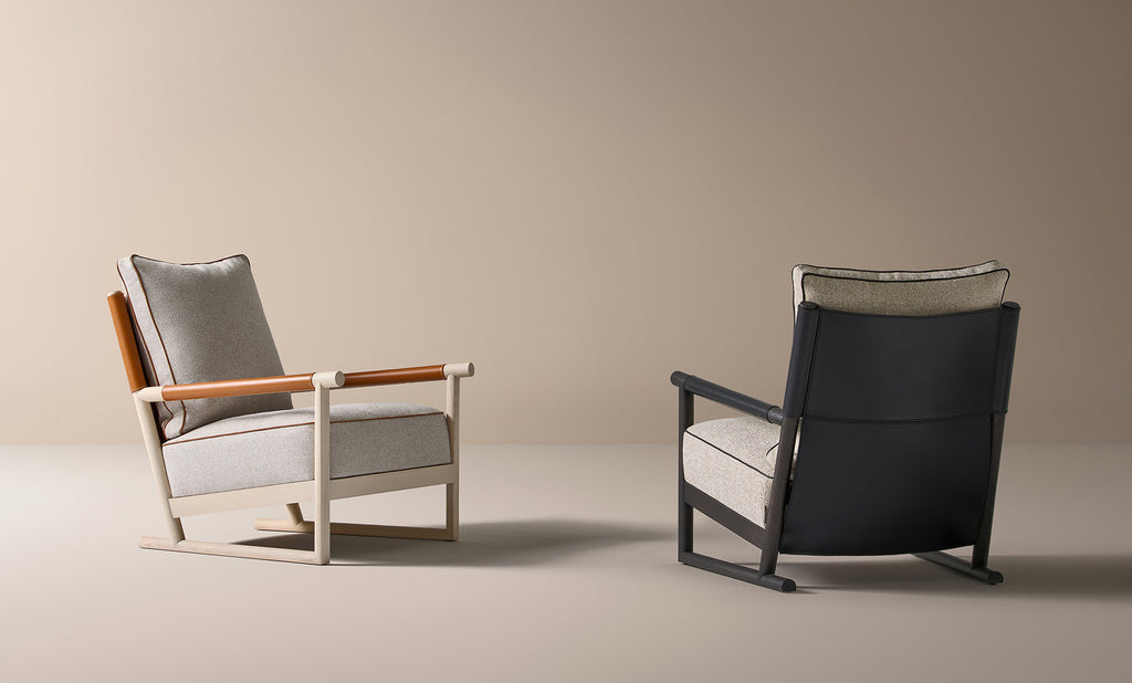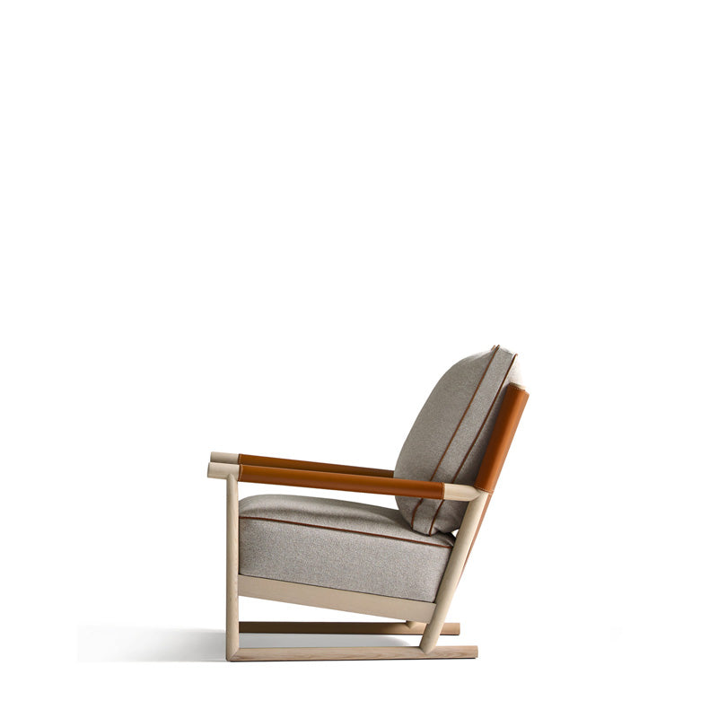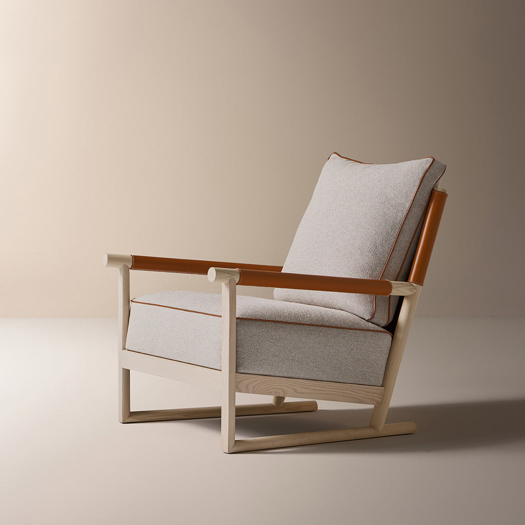 The Ischia armchair is a masterful blend of refined contrasts: sturdy yet lightweight, architectural yet inviting, essential yet rich in detail. Its solid ash wood frame forms an intricate play of angles and precise joints, elegantly framing the upholstered seat and leather backrest.